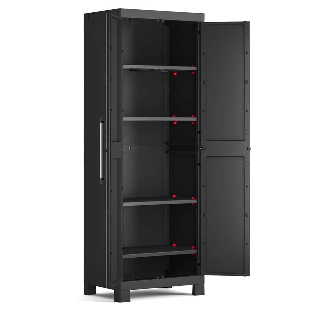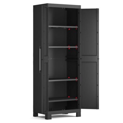 Wysoka szafa Detroit wykonana została z wysokiej jakości tworzywa sztucznego. Materiał odznacza się wysoką odpornością na uszkodzenia mechaniczne, a dodatkowo jest bardzo łatwy w utrzymaniu czystości. Wnętrze szafy zostało wyposażone w cztery półki o maksymalnej ładowności do 15 kg. Możliwość regulacji ich wysokości pozwala spersonalizować szafę pod kątem indywidualnych potrzeb. Solidna konstrukcja osadzona została na podwyższonych, regulowanych nogach, co dodatkowo podkreśla elegancki charakter mebla i ułatwia sprzątanie pod meblem. Kolejnym atutem wysokiej szafy Detroit są ergonomiczne i smukłe uchwyty zwiększające komfort użytkowania mebla. Prezentowany model doskonale sprawdzi się w garażu, warsztacie czy innym pomieszczeniu gospodarczym. Estetycznie wykonana, wykończona w odcieniu matowej czerni idealnie dopasuje się do aranżacji każdej przestrzeń.