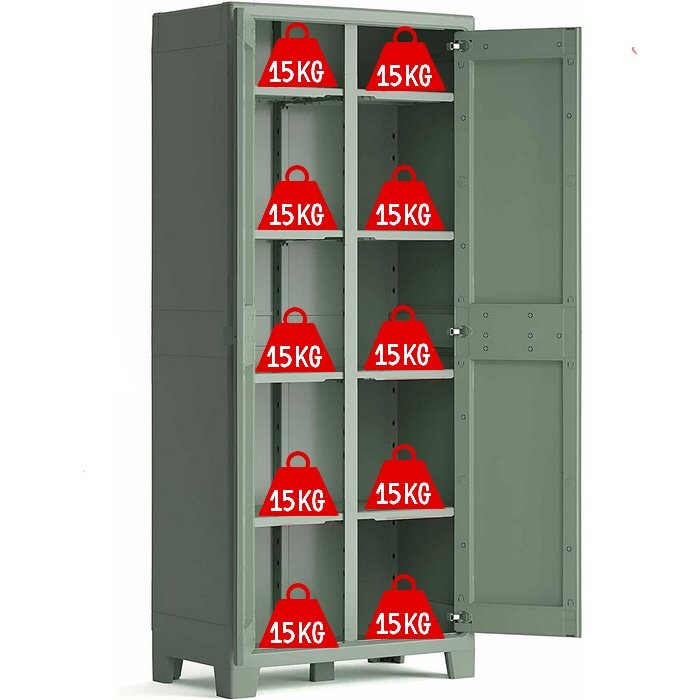 Szafa wykonana została z wysokiej jakości tworzywa sztucznego, pochodzącego w 80% z recyklingu. Konstrukcja jest w wodoodporna oraz odporna na niesprzyjające działanie czynników atmosferycznych, w tym promieniowanie UV. Stabilna i wytrzymała szafa nadaje się do przechowywania wszelkiego rodzaju asortymentu. Wnętrze wysokiej szafy Planet Outdoor wyposażone zostało w cztery półki z funkcją regulacji wysokości na kilku poziomach – o obciążeniu 2 razy po 15 kg każda. Pólki posiadają pionową przegrode. Można półki zdemontować po jednej stonie i dzięki temu uzyskamy pionową komore np. na miotłe czy wędki. Ergonomiczne uchwyty zapewniają komfortowe otwieranie i zamykanie drzwiczek. Z kolei delikatnie podwyższone, regulowane nóżki ułatwiają sprzątanie i utrzymanie porządku pod szafą. Szafa przystosowana jest do samodzielnego i łatwego montażu.